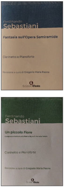 Gregorio Maria Paone is a young clarinet player from southern Italy who obtained various degrees from different Italian universities. He is a performer and capable researcher. He also wrote a specific book on Ferdinando Sebastiani, published, like the two pieces presented here, by Efesto. The little and unpretentious fantasy Un piccolo fiore (a small flower) has themes taken from the third act of Gaetano Donizetti’s Lucia di Lammermoor and was dedicated to Esimia Signorina Marietta Tortola, probably a friend of the composer. The other Fantasy is more elaborate and demanding, having a famous theme from Semiramide of Rossini with florid writing, some written-out cadenzas, and a brilliant show-off style final part. We must say thank you to both Gregorio Maria Paone and Efesto Editions for rediscovering these two nice compositions of Sebastiani. Now, we can have more operatic fantasies to consider in addition to the well-known ones of Bassi (Rigoletto) and Lovreglio (Traviata).